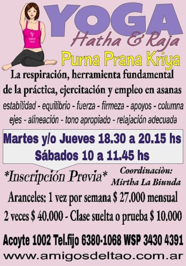 Preparación psico-corporal, trabajos respiratorios, de columna, asanas tradicionales, no tradicionales, con variantes y adaptaciones para distintas posibilidades. Secuencias dinámicas.